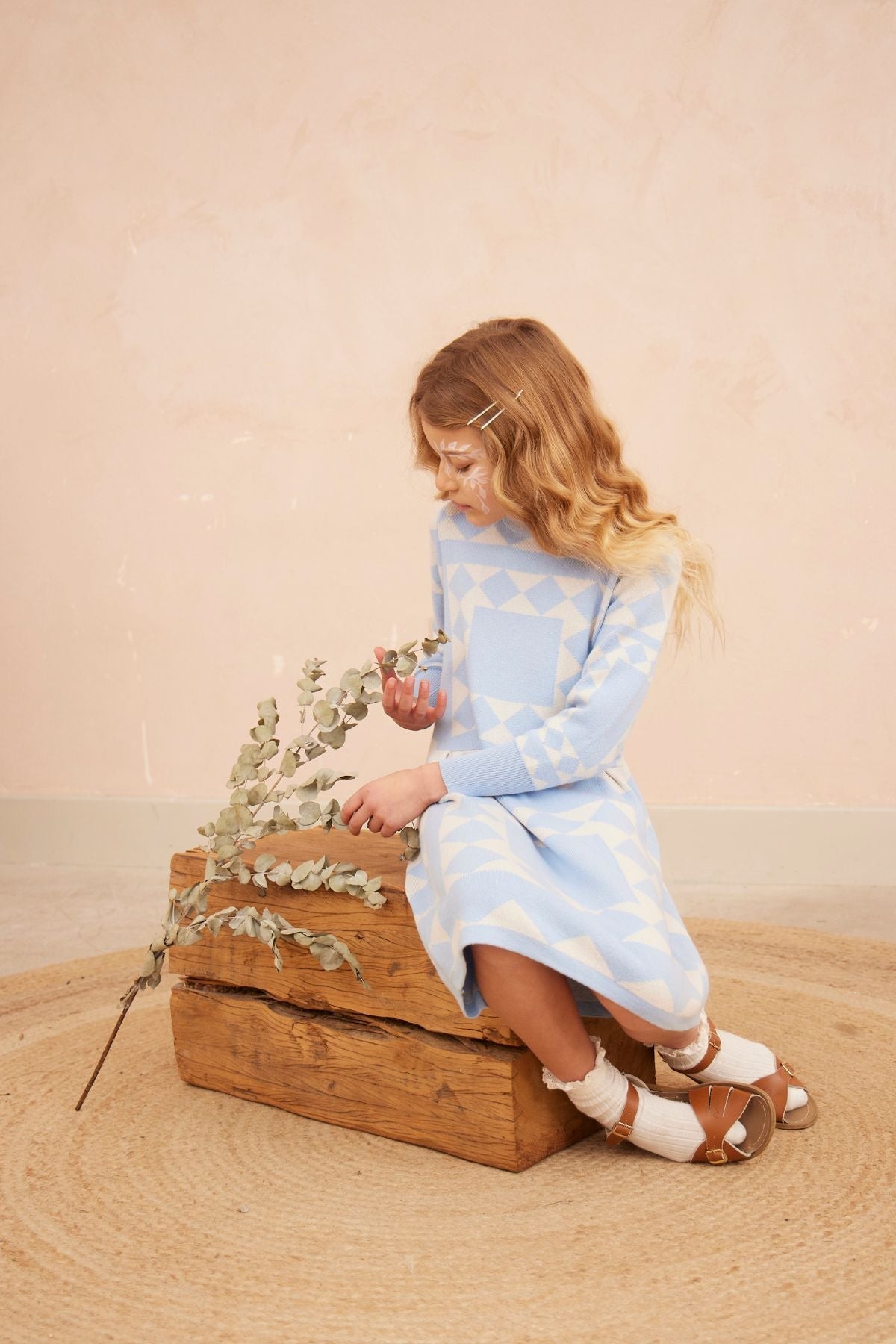 A journey in pattern and play. This bold dress features a vibrant, Aztec-inspired geometric motif, channeling artisanal heritage into a modern design for little adventurers.
