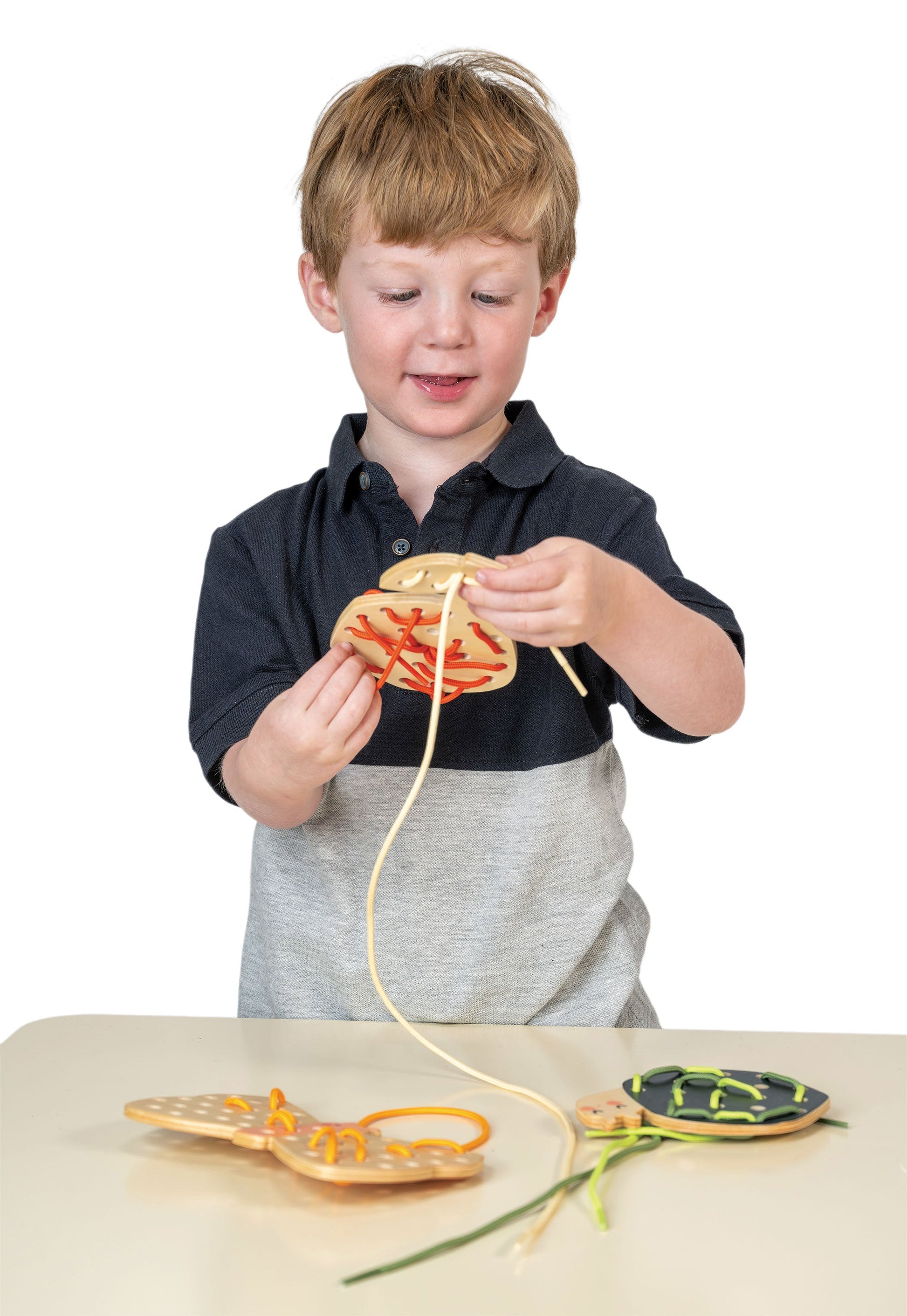 Create endless combinations of coloured cord lines on these 3 charming garden-themed lacing boards – a butterfly, a flower, and a snail.