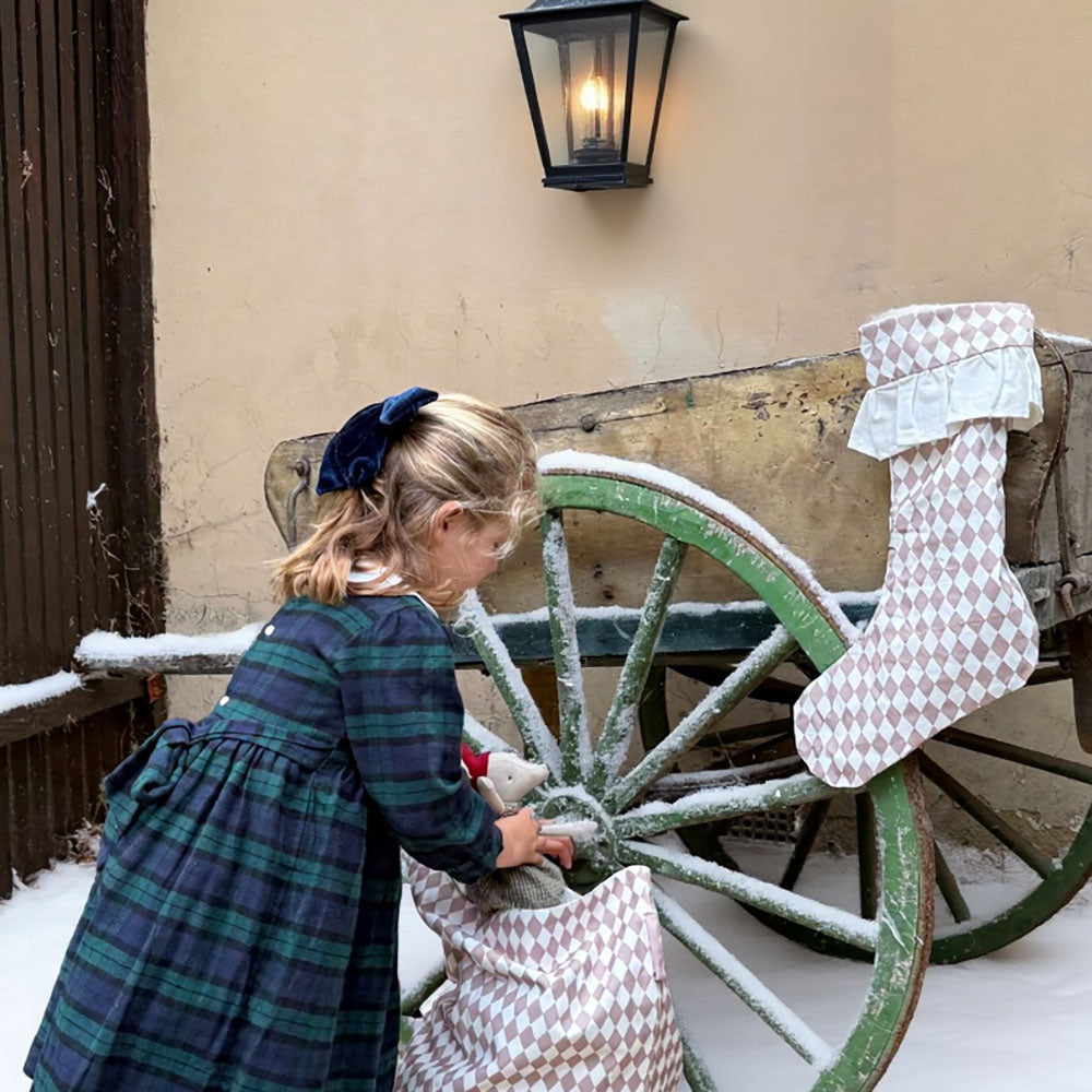 Hung by the fire or at the foot of the bed, our Harlequin Ruffled Stocking captures the enchantment of Christmas Eve. Crafted from durable cotton canvas, the stocking is fully lined with a harlequin pattern inside and out. A delicate ruffle flutters softly along the edge, adding a playful yet timeless detail. Perfectly sized for small gifts and treats, it is designed as a keepsake for generations.