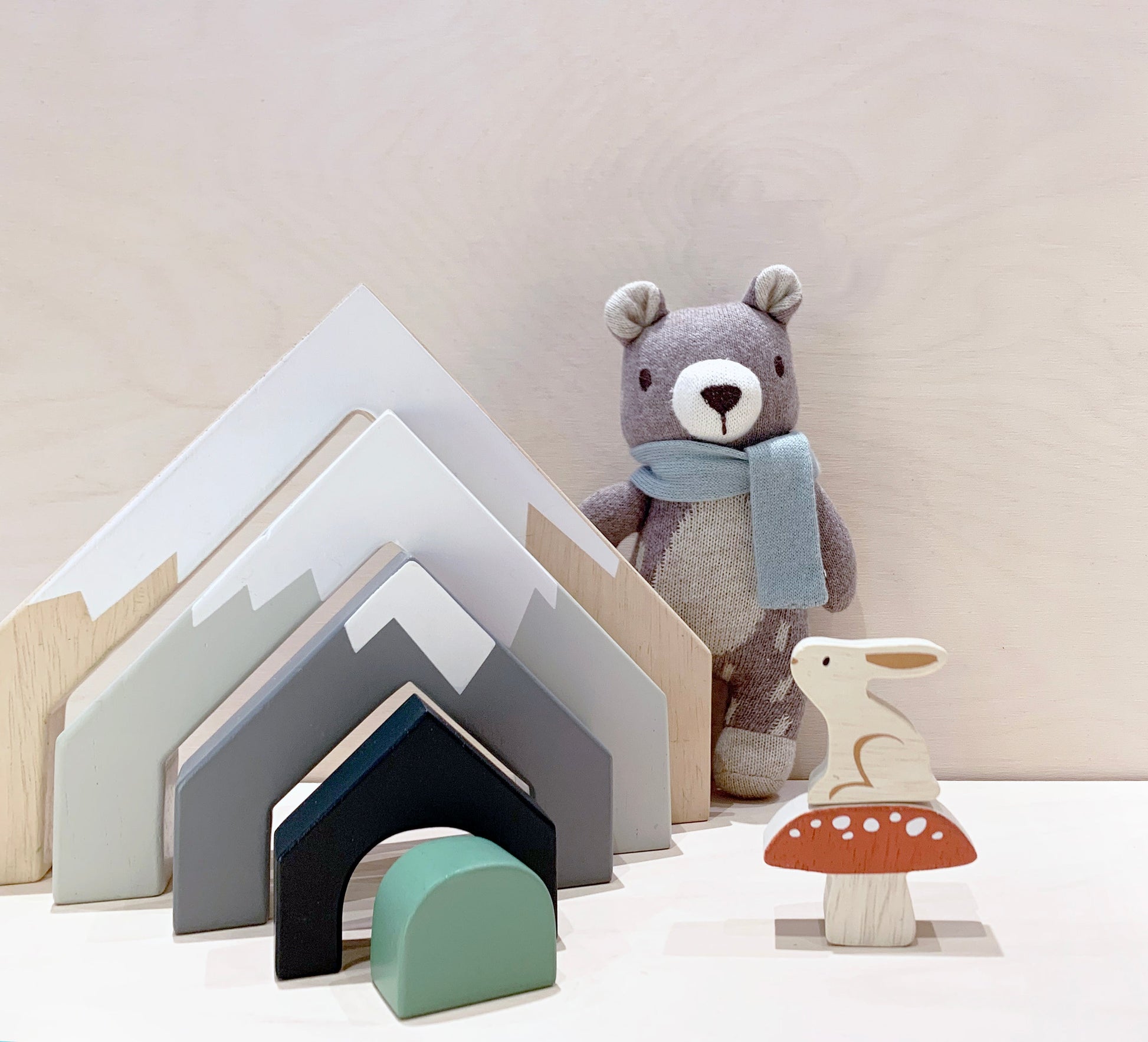 An accessory to the wooden Treetops Train Set or to be enjoyed as a tunnel toy, 5 mountain shape arches are all cut from one solid piece of rubberwood and illustrated to evoke the natural world.