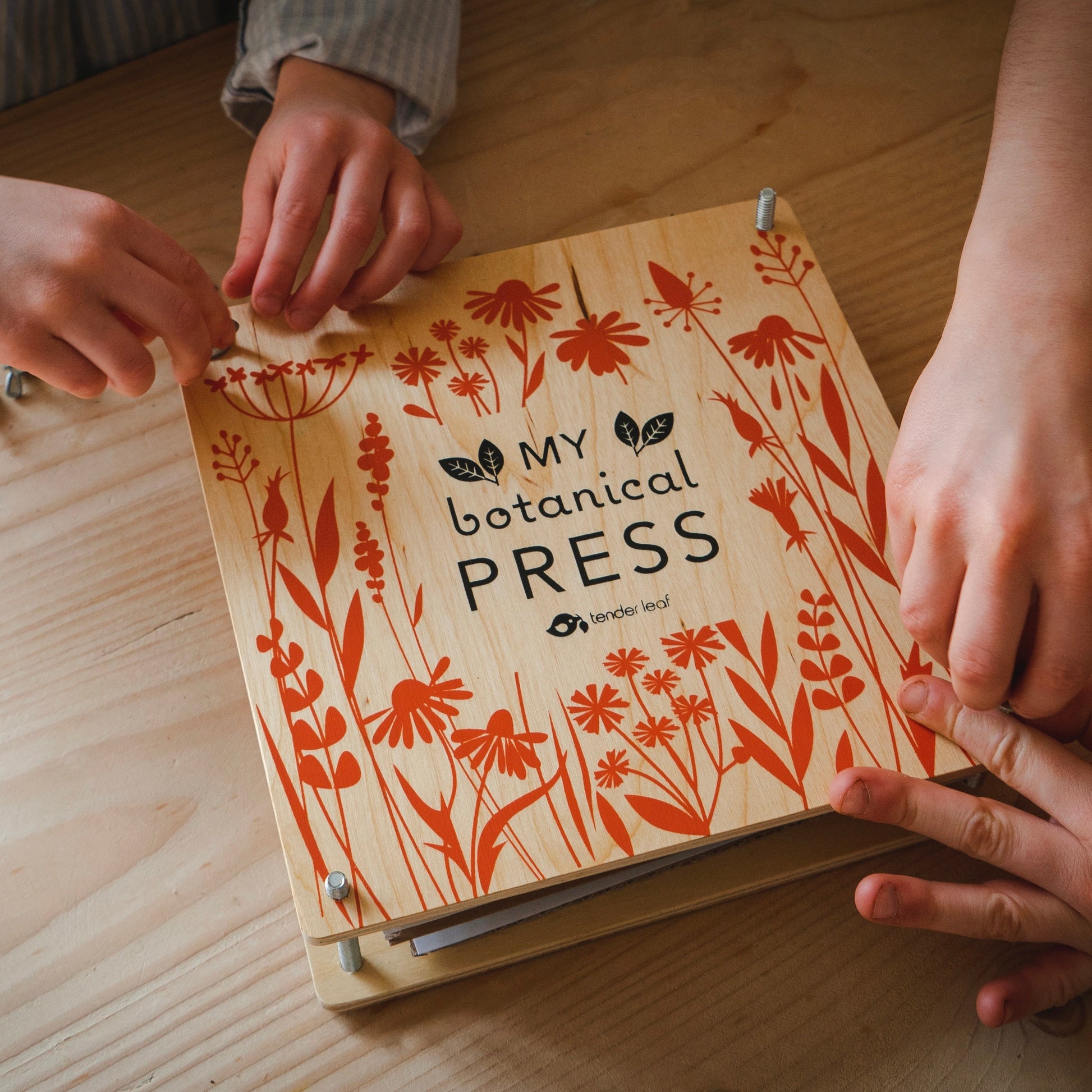 The two wood presses are filled with paper sheets and little metal screws at each corner so that you are able to tightly press the pages together. Filling your pages with flowers and leaves is a great garden hunt activity, and after a couple of weeks being tucked away in their pages, you can open the press back up to reveal beautiful flat delicate dried flowers, ready to use in any arts and crafts activity.