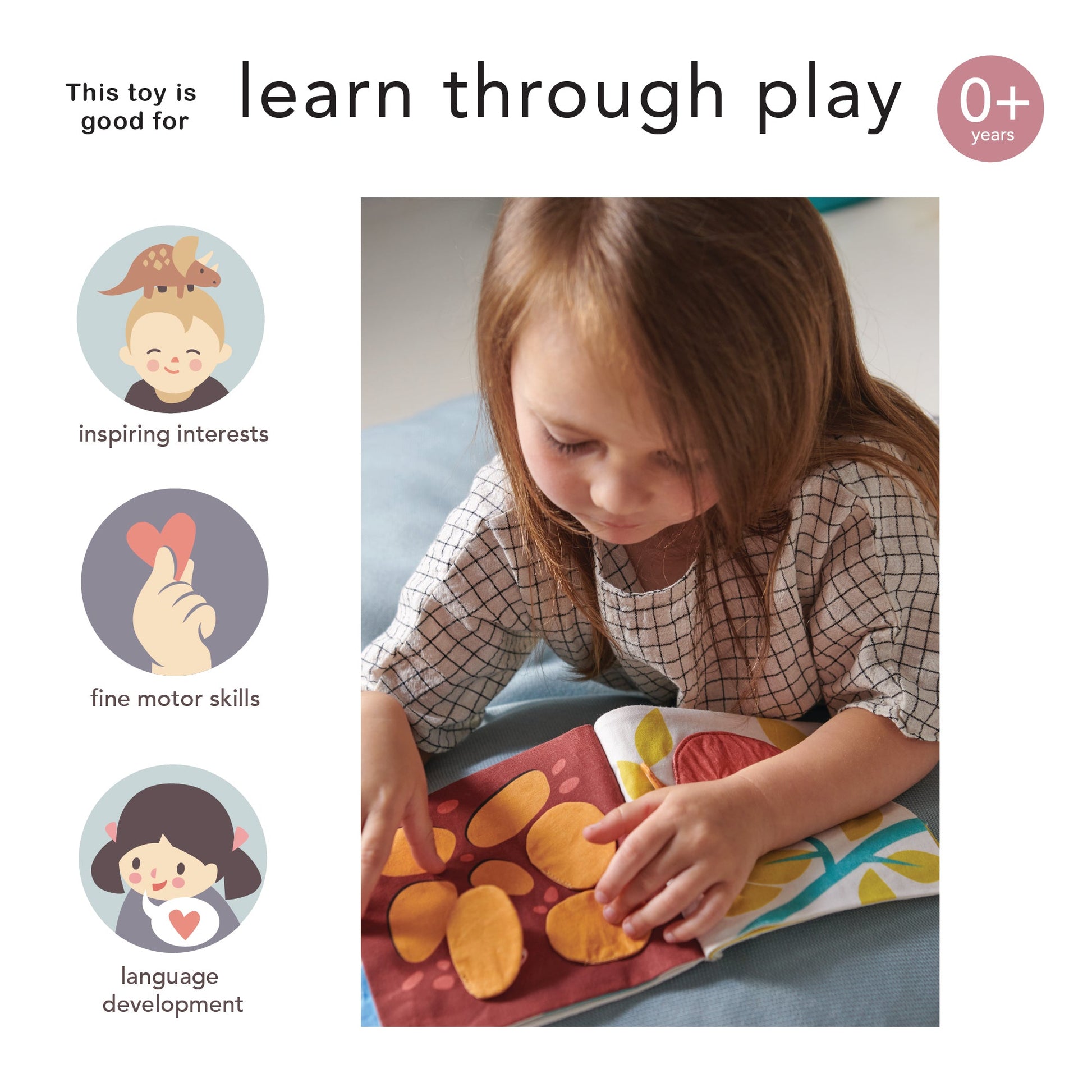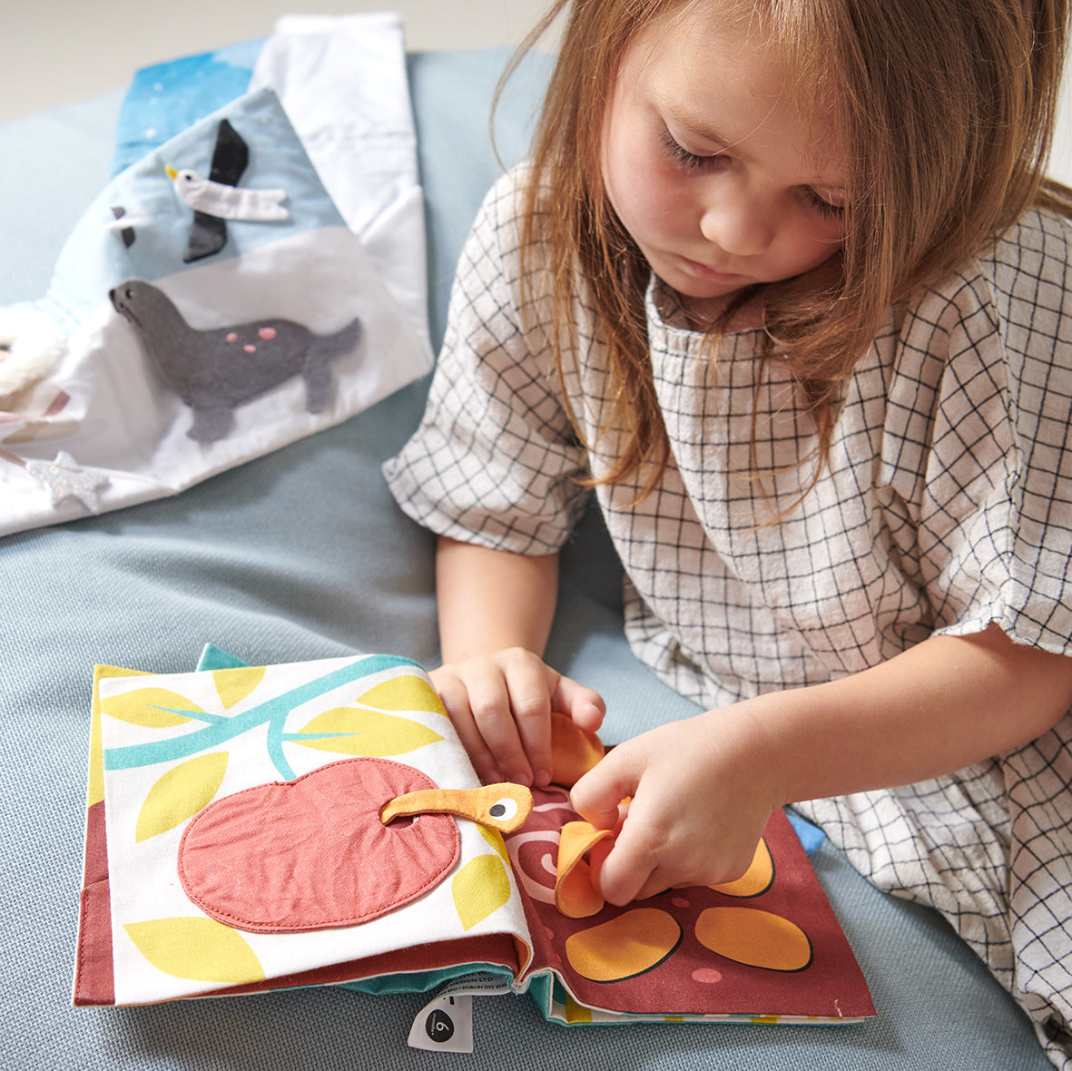 A garden themed soft fabric activity book complete with hide away flaps, and pockets to keep a baby entertained. Illustrated in soft retro colours, and complete with a leafy tie so that it can be attached to the buggy.