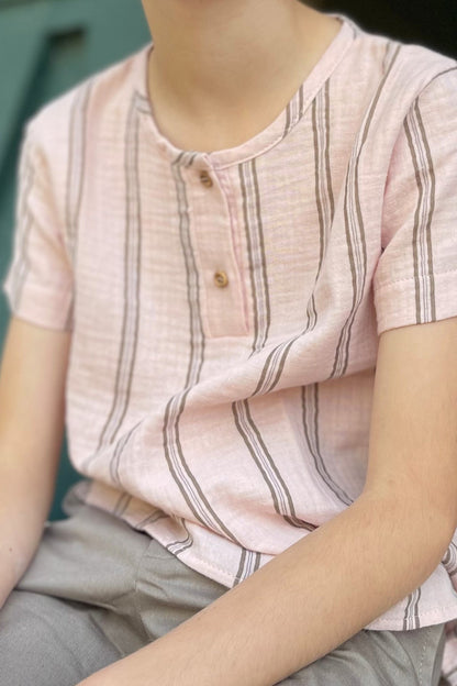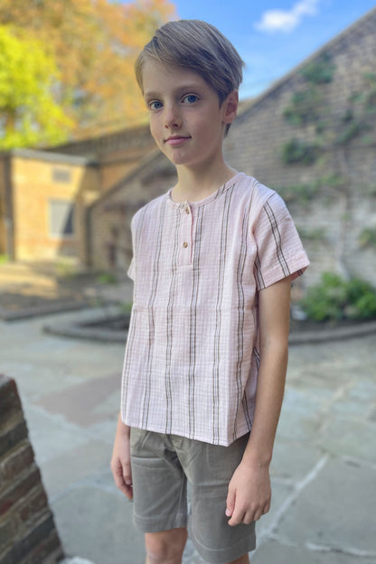 A new summer favourite for the wardrobe of your little boy. This pastel shirt decorated with brown stripes is made from a soft and eco friendly 100% organic cotton.