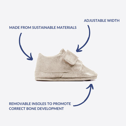 A new meaning to the phrase ‘Twinkle- Toes’. Apart from being absolutely adorable, these booties are a soft and padded choice for your little one’s feet when out and about while still not being restrictive for little growing feet. With a removable insole, there's plenty of extra room to grow into. Better yet, when your baby does outgrow their pair, send them back to us for recycling and receive £10 off your next order.
