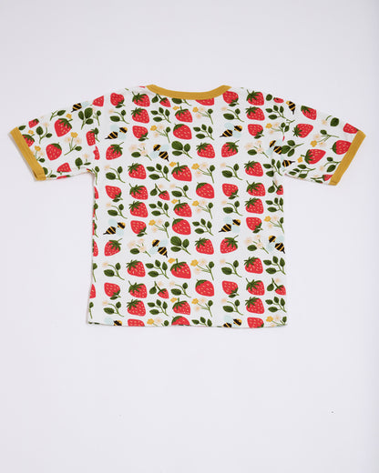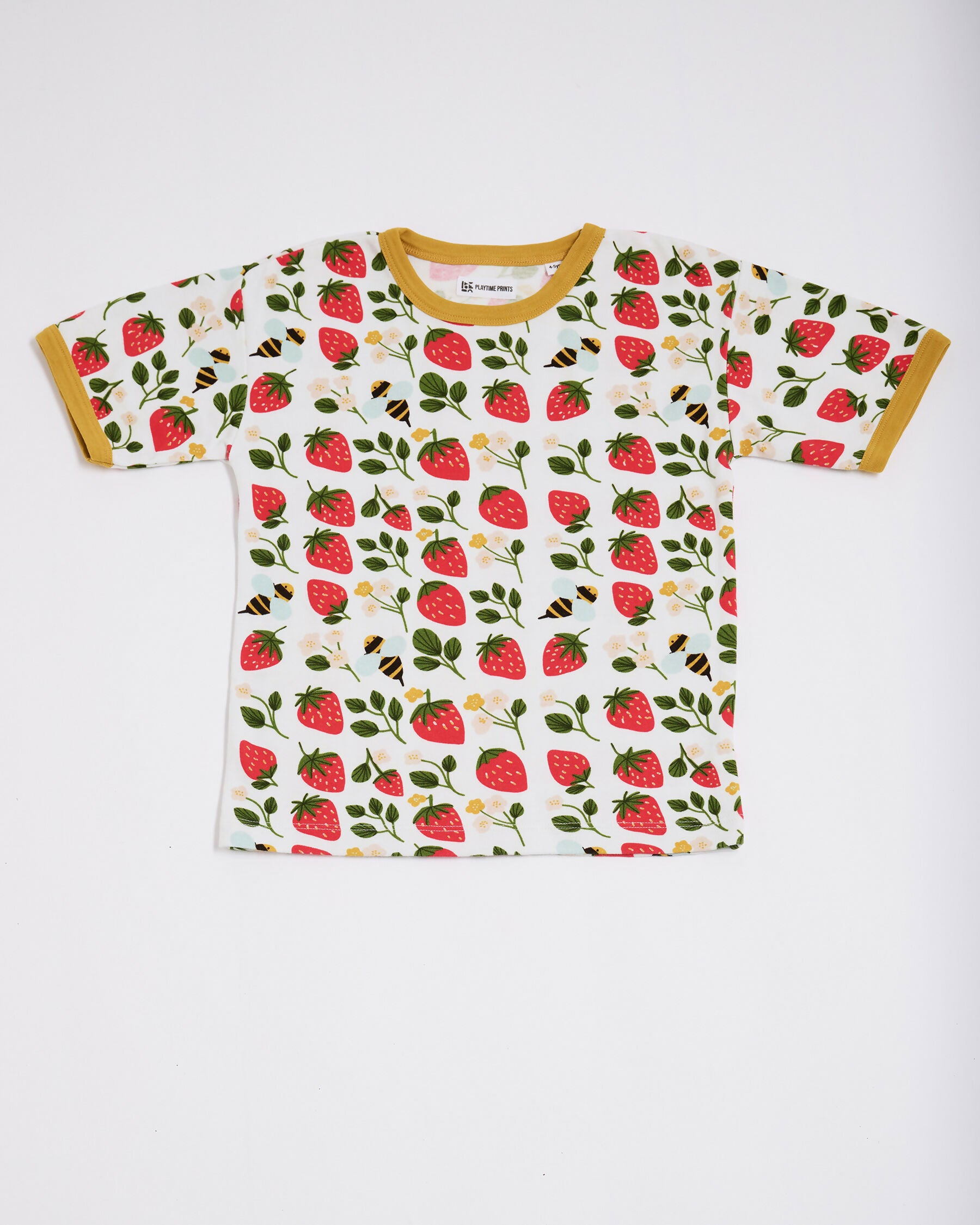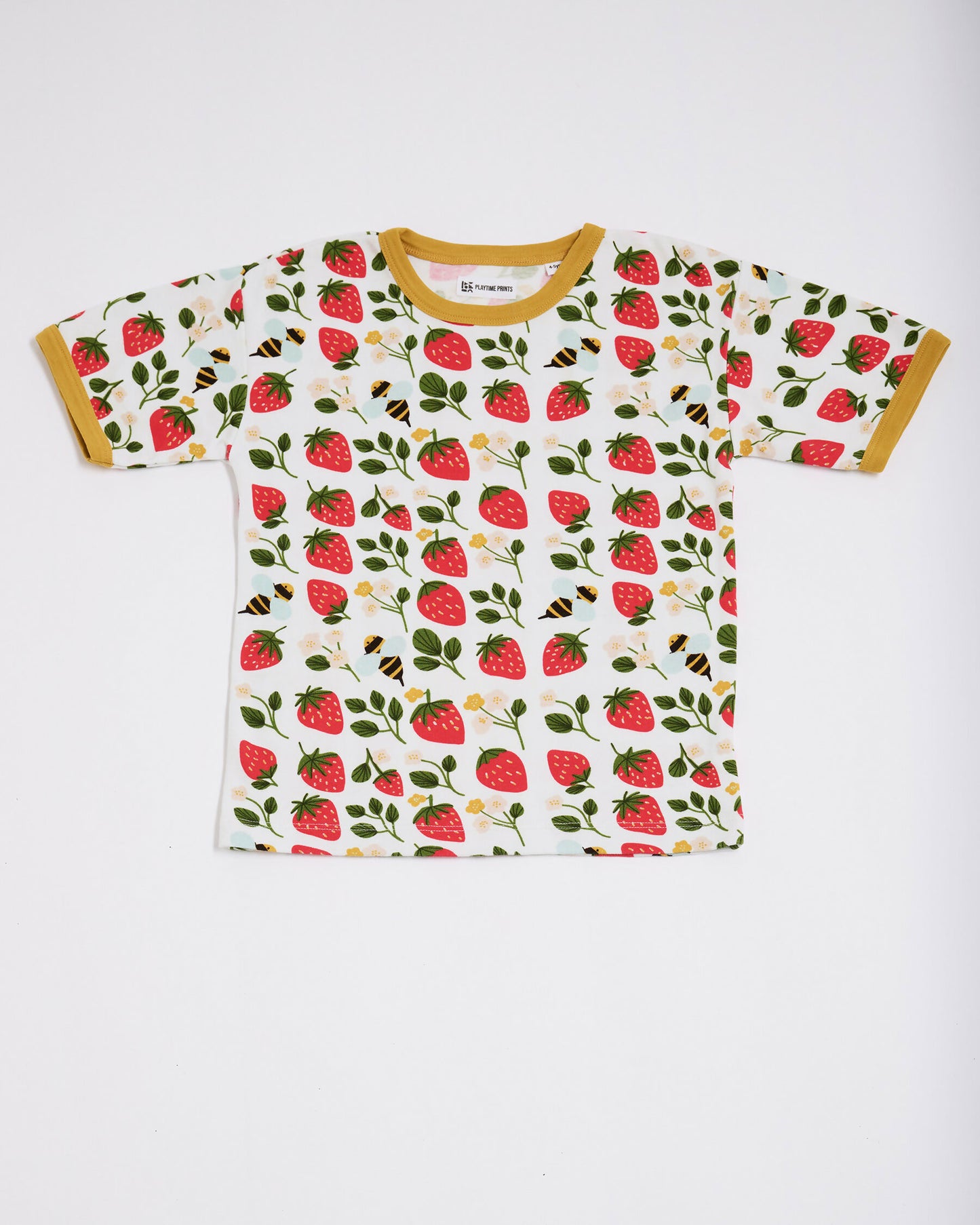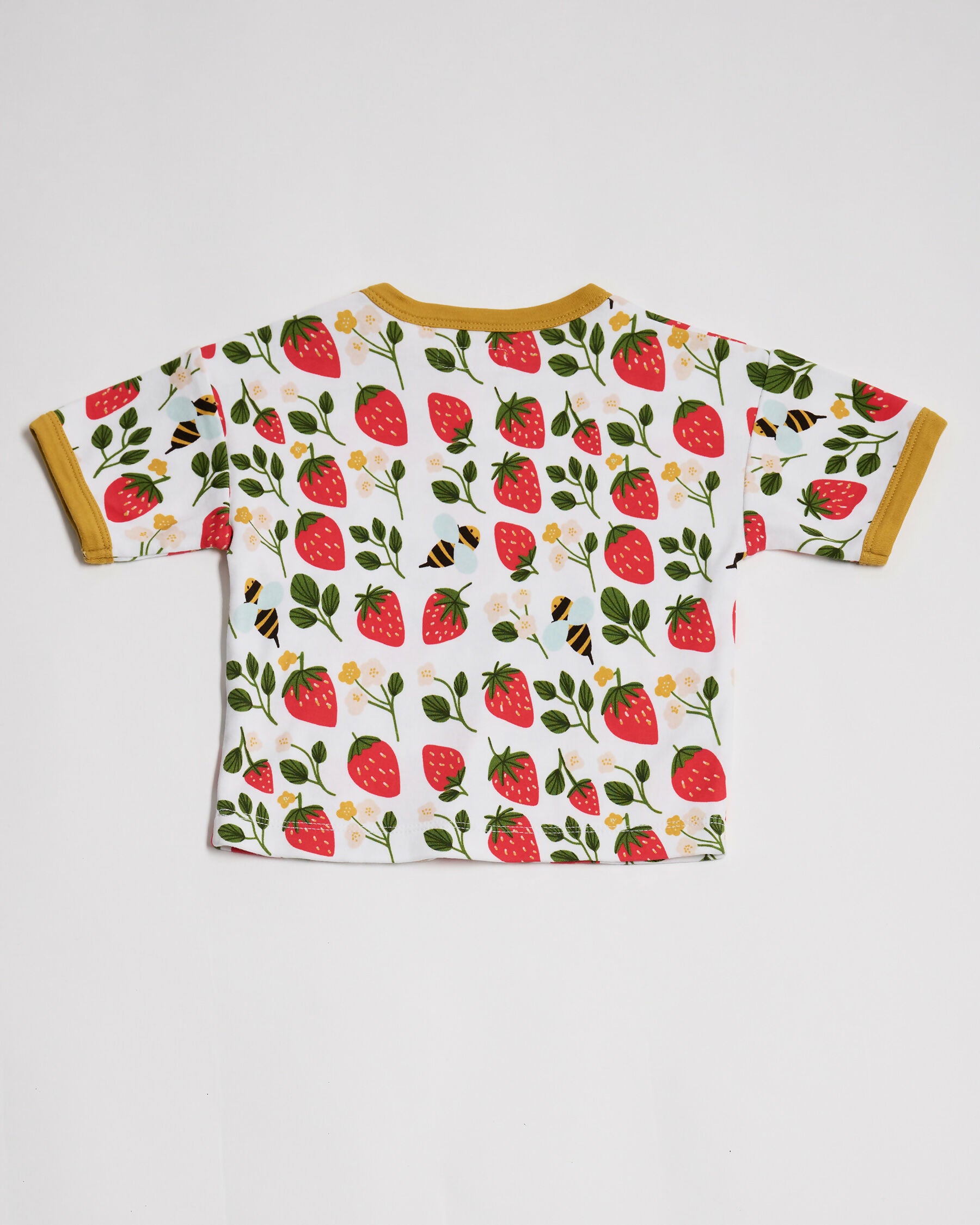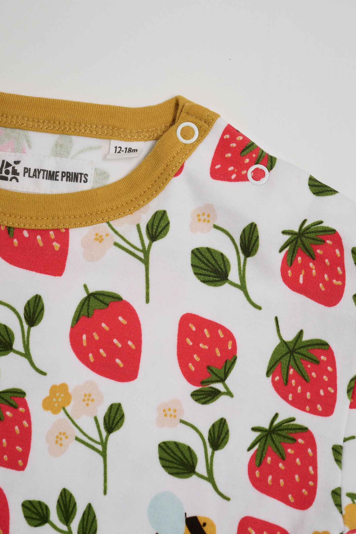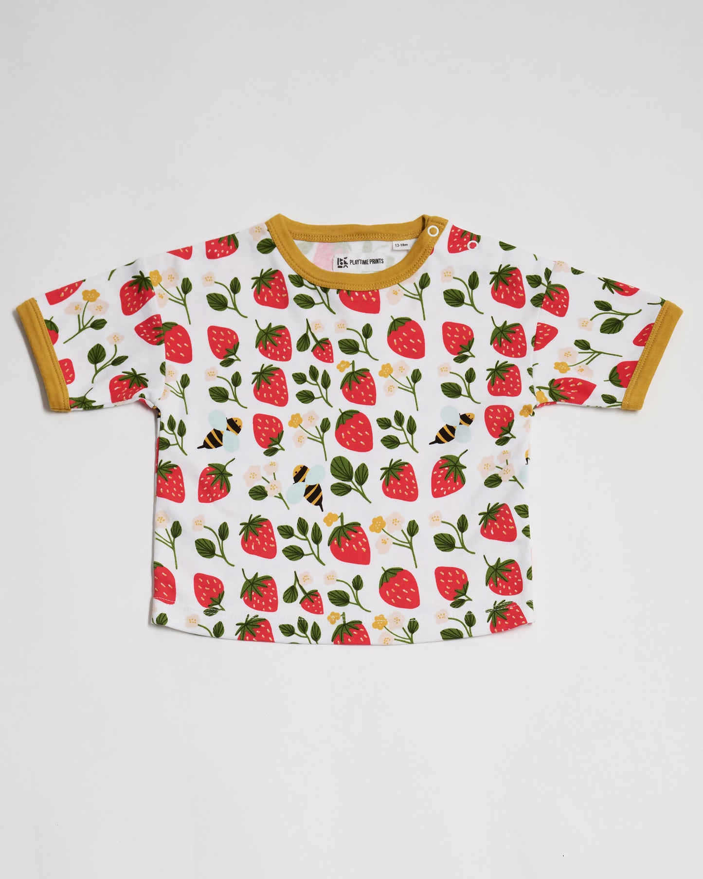 Feeling fruity? Featuring Playtime Prints' signature relaxed fit, playful Strawberry Fields print and a warm honey contrast trim, this tee screams British summertime. Made with 100% organic cotton for maximum comfort. Looks great paired with the Strawberry Fields dungarees.