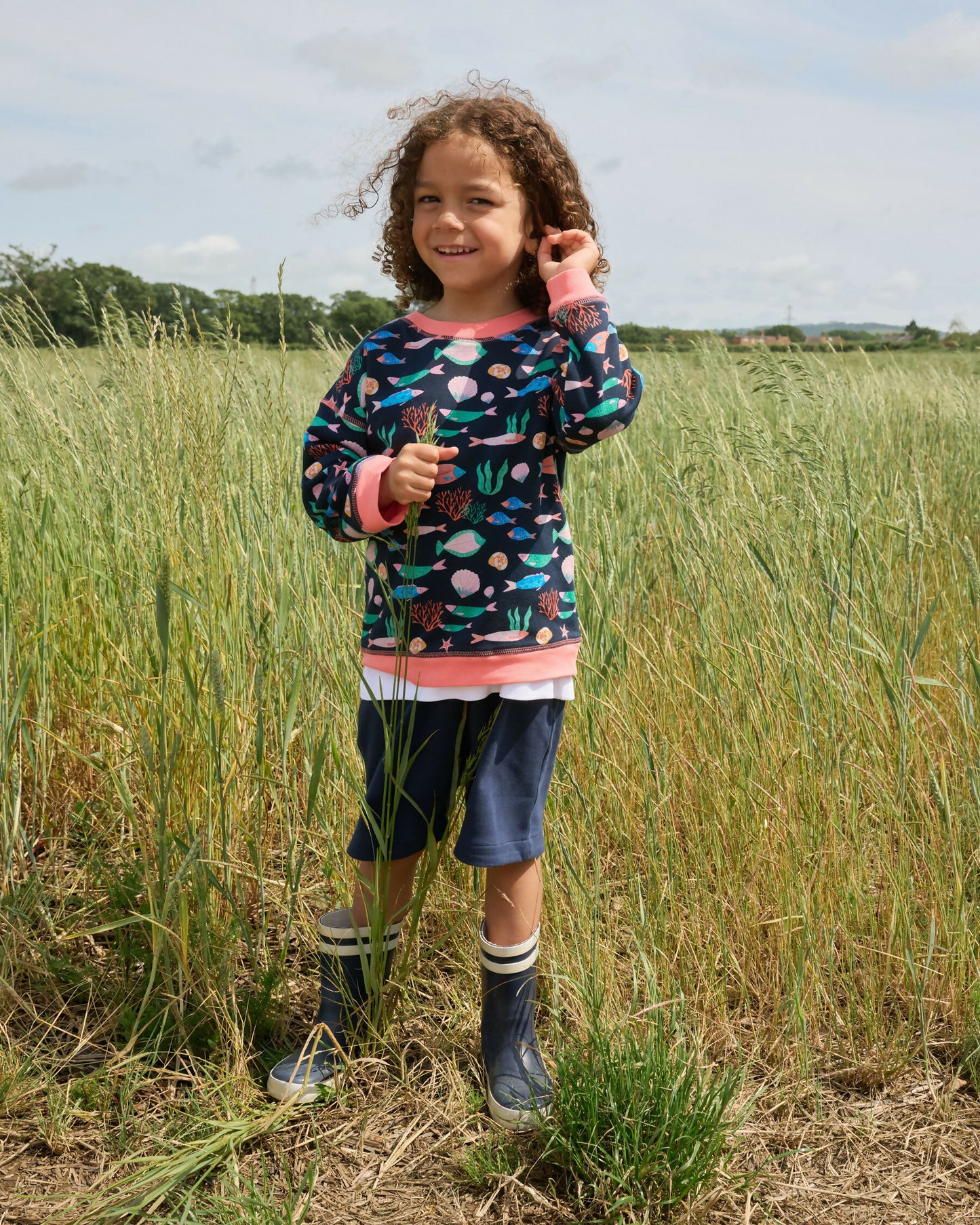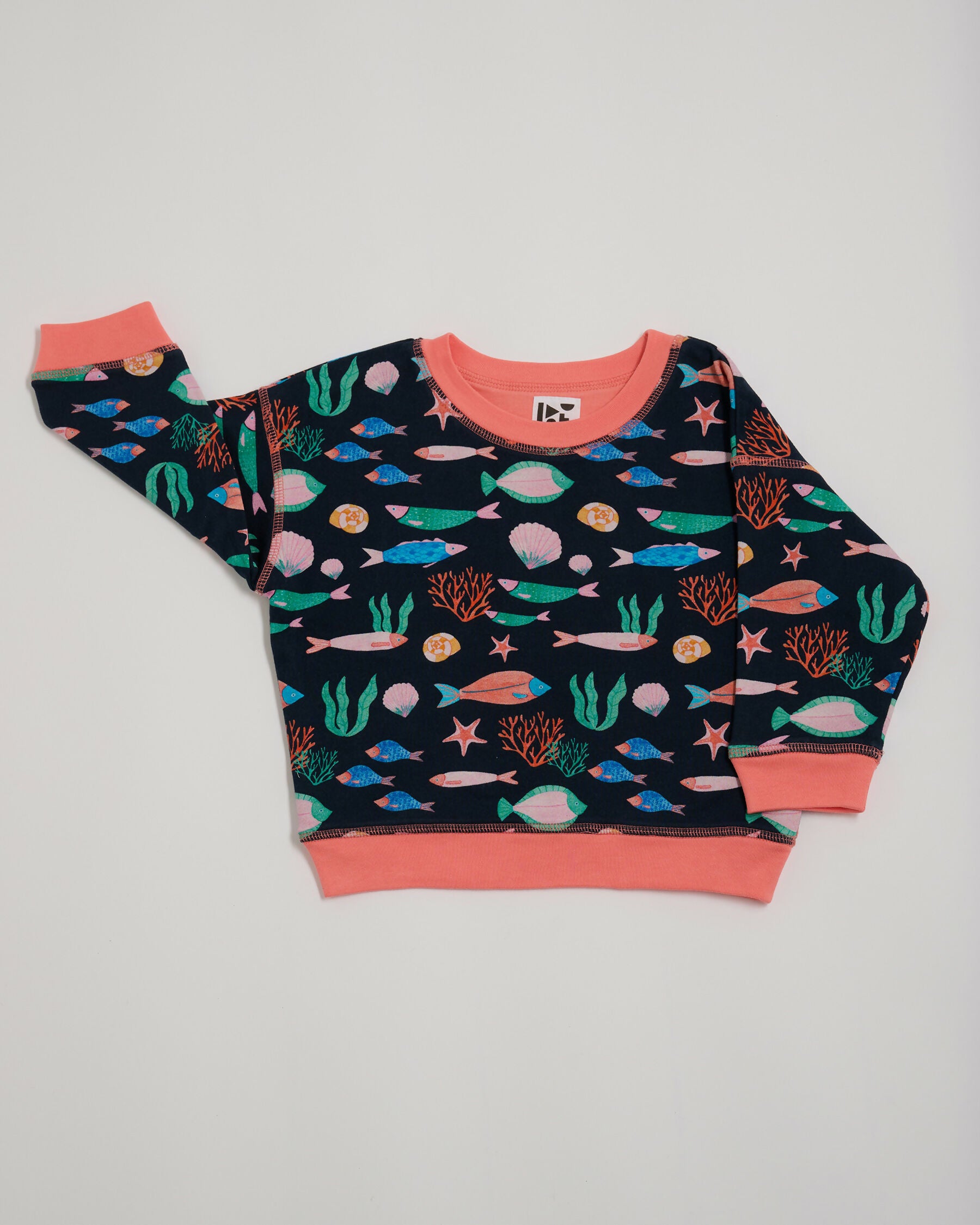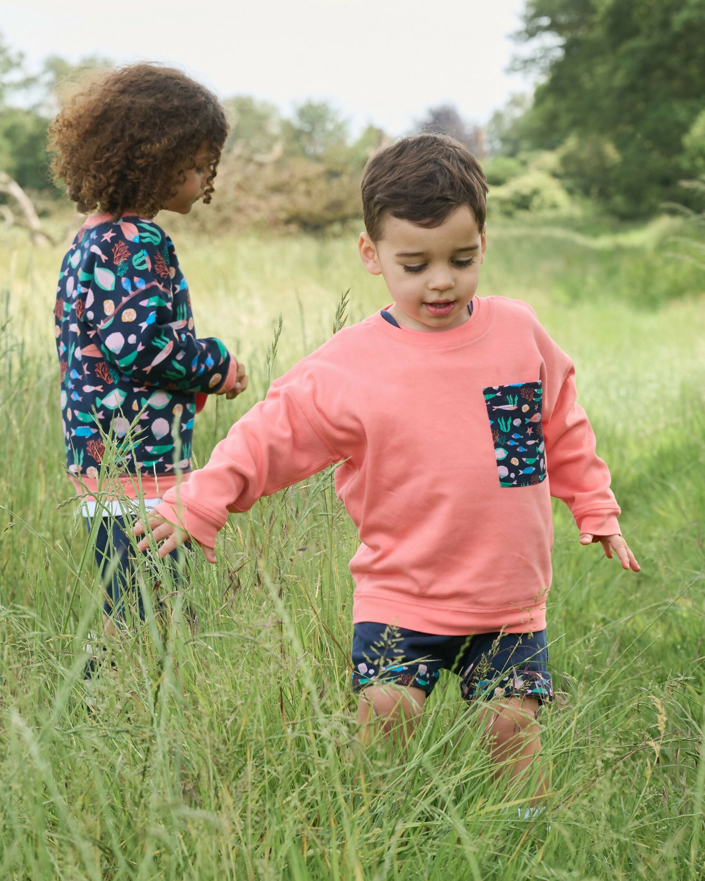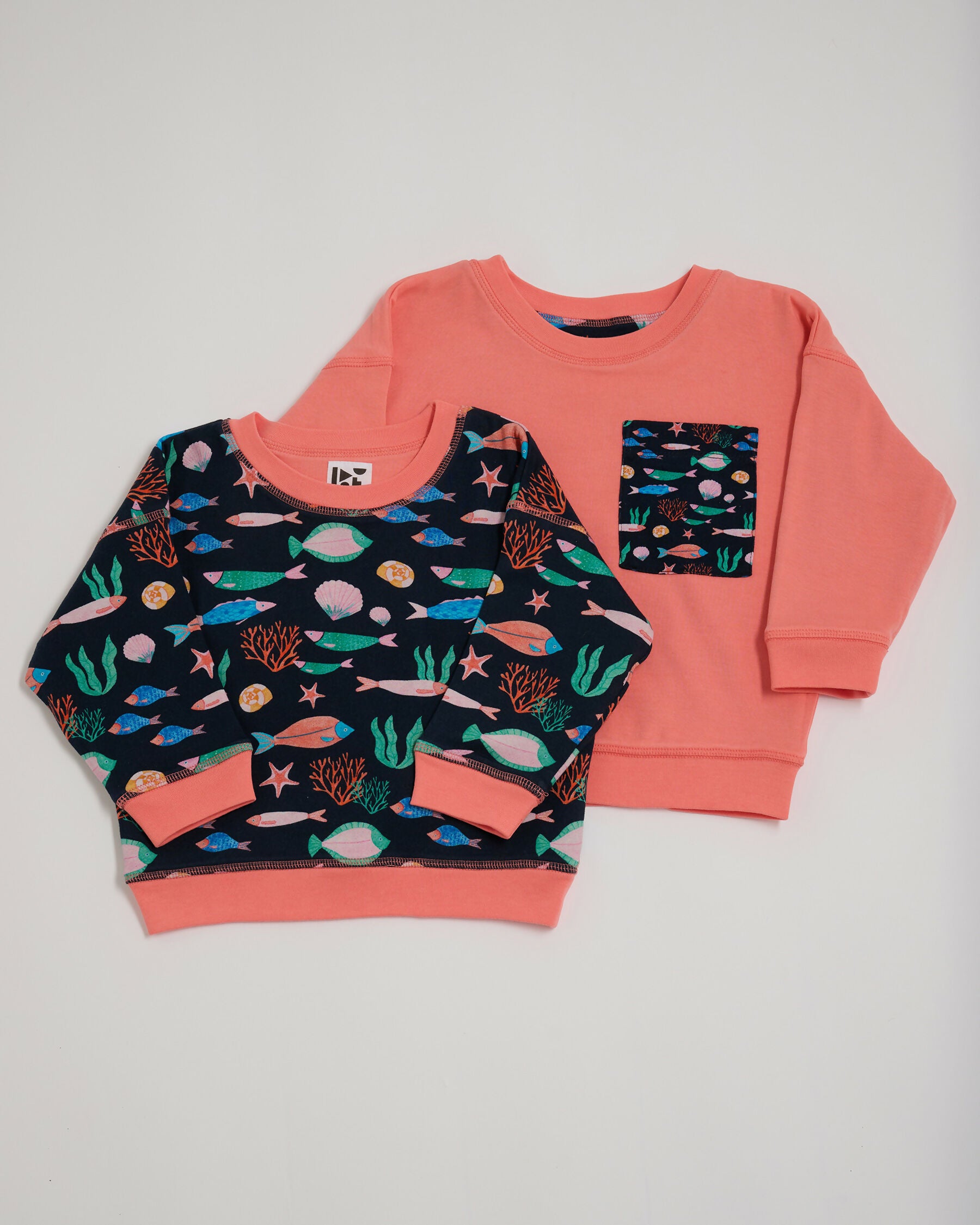 Enjoy two looks in one with this modern reversible sweatshirt. Crafted from 100% organic cotton for a soft, comfy feel and featuring the Playtime Prints signature relaxed fit, it’s perfect for everyday wear. Switch effortlessly between bold full print for a statement look or keep it simple and stylish in block colour with an oversized printed pocket.